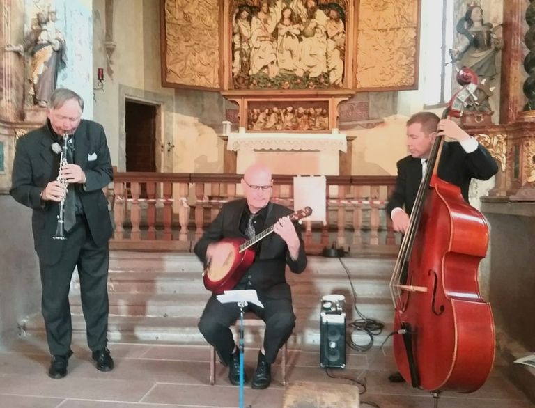 Dr. Wim Mauthe (Klarinette, Saxophon, Akkordeon, Gesang) Martin Hess (Kontrabass) und Eric Cousin (Banjo, Gitarre)
